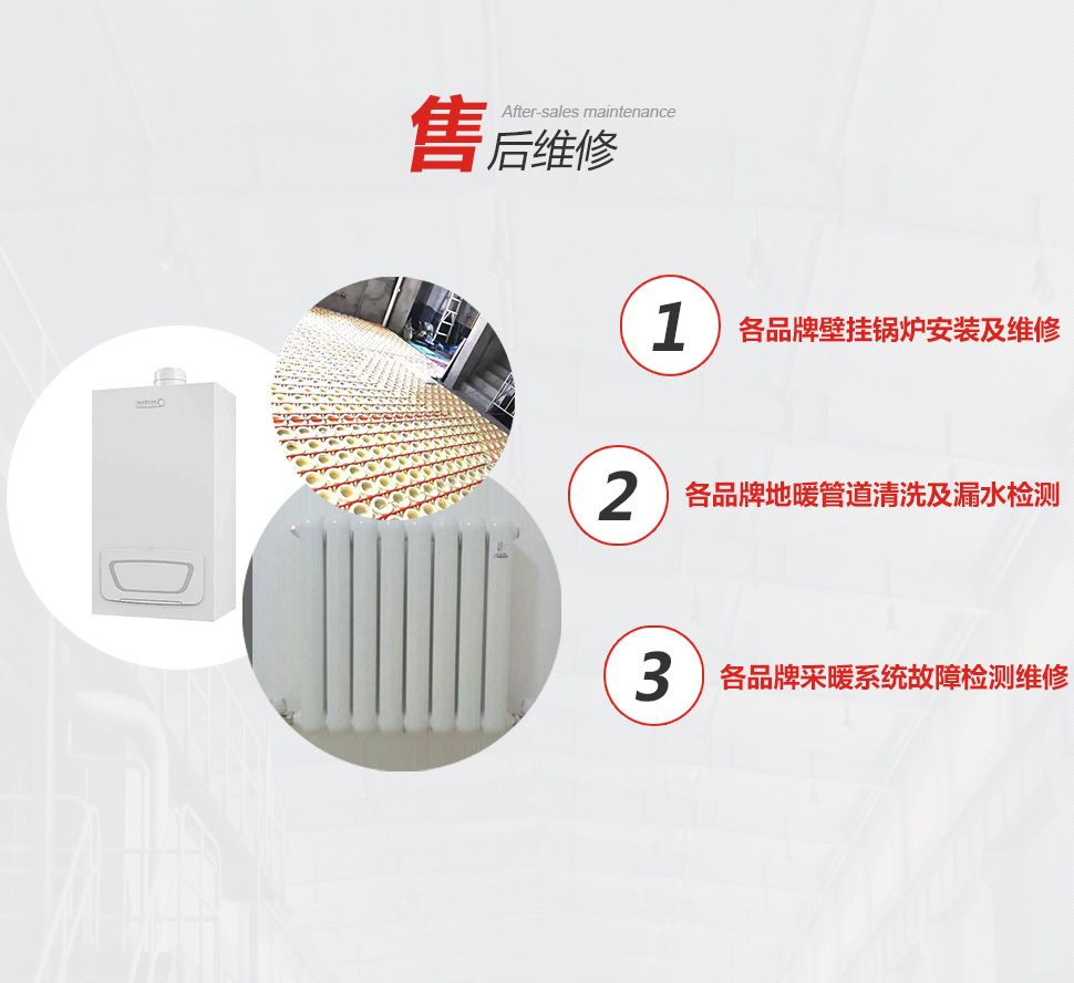 公司承接各品牌型號(hào)壁掛爐安裝維修,地暖管道清洗及漏水檢測(cè),采暖系統(tǒng)故障檢測(cè)及維修。